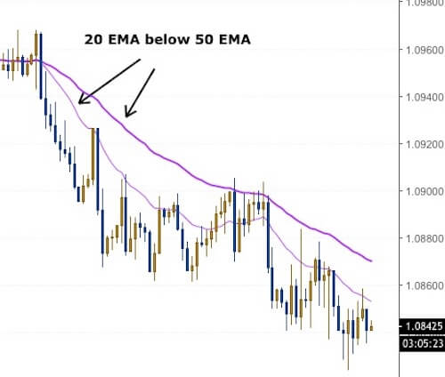 And if the 20 EMA is below the 50 EMA and is forming lower highs and lower lows, the market is in a downtrend.