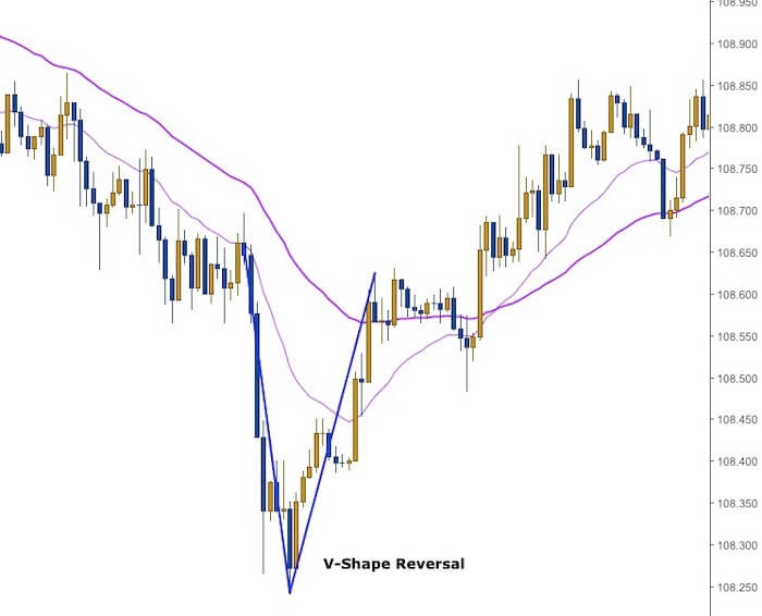 The V-shape reversal is a sharp market move downwards and followed by a sharp movement upwards.