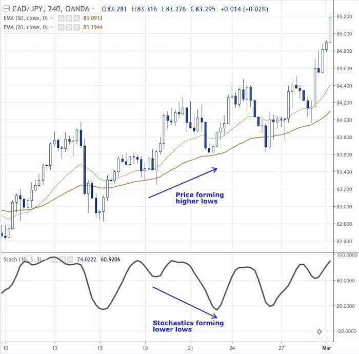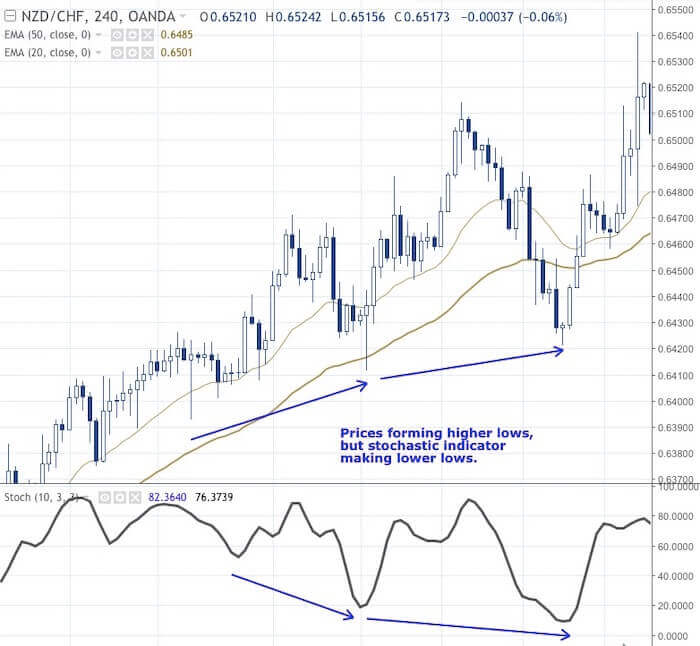 In the chart above, you can see that price is making lower lows, but the stochastic indicator is making higher lows.