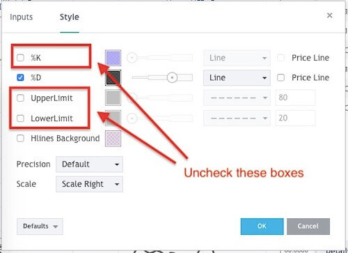 Hence, we will remove the Overbought and Oversold lines, and also make %K invisible so we only get to see %D as on the charts.