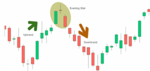 The Evening Doji Star appears at the top of an uptrend, warning traders of potential downside: