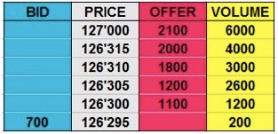 At this point, you want to either place your order at 126’305 Bid or lift the Offer at 126’310 if the Offer is about to go.
